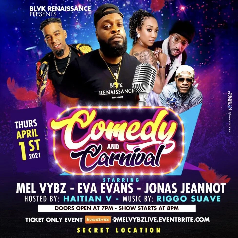 Comedy & Carnival Thursday, April 1, 2021 7:00 PM 11:00 PM 19:00 23:00 New York USA (map) Google Calendar ICS BLVK RENAISSANCE PresentsCOMEDY & CARNIVALHosted By:HAITIAN VComedians:MEL VYBZEVA EVANSJONAS JEANNOTMusic By:RIGGO SUAVETickets:PURCHASE HERE