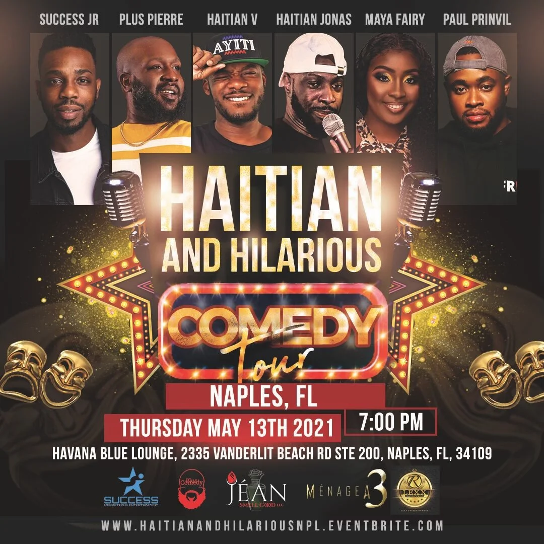 Haitian & Hilarious Comedy Tour (Naples) Thursday, May 13, 2021 7:00 PM 11:00 PM 19:00 23:00 Havana Blue Lounge 2335 Vanderbilt Beach Road Naples, FL, 34109 United States (map) Google Calendar ICS HAITIAN & HILARIOUS COMEDY TOURComedians:SUCCESS JR.PLUS PIERREHAITIAN VHAITIAN JONASMAYA FAIRYPAUL PRINVILTickets:PURCHASE HERE
