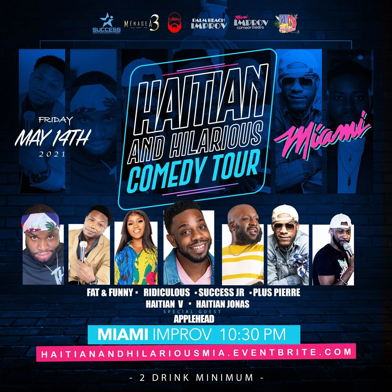 Haitian & Hilarious Comedy Tour (Miami) Friday, May 14, 2021 10:30 PM 22:30 Saturday, May 15, 2021 12:30 AM 00:30 Miami Improv 3450 Northwest 83rd Avenue Doral, FL, 33166 United States (map) Google Calendar ICS HAITIAN & HILARIOUS COMEDY TOURComedians:FAT & FUNNYRIDICULOUSSUCCESS JR.PLUS PIERREHAITIAN VHAITIAN JONASSpecial Guest:APPLEHEADTickets:PURCHASE HERE