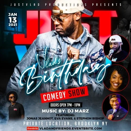 Vlad & Friends Birthday Comedy Show Thursday, January 13, 2022 7:00 PM 11:00 PM 19:00 23:00 New York USA (map) Google Calendar ICS JustVlad Prod. PresentsVlad & Friends Birthday Comedy ShowComedians:STEPHON BISHOPEVA EVANSJONAS JEANNOT& MOREMusic By:DJ MARZTickets:PURCHASE HERE