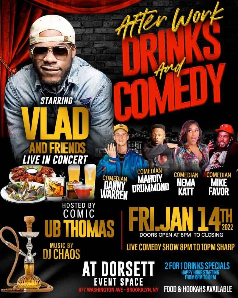 Afterwork Drinks & Comedy Friday, January 14, 2022 8:00 PM 10:00 PM 20:00 22:00 Dorsett Event Space 677 Washington Avenue Brooklyn, NY, 11238 United States (map) Google Calendar ICS AFTER WORK DRINK & COMEDYHosted By:UB THOMASComedians:DANNY WARRENMAHDIY DRUMMONDNEMA KATTMIKE FAVORHAITIAN VMusic By:DJ CHAOS