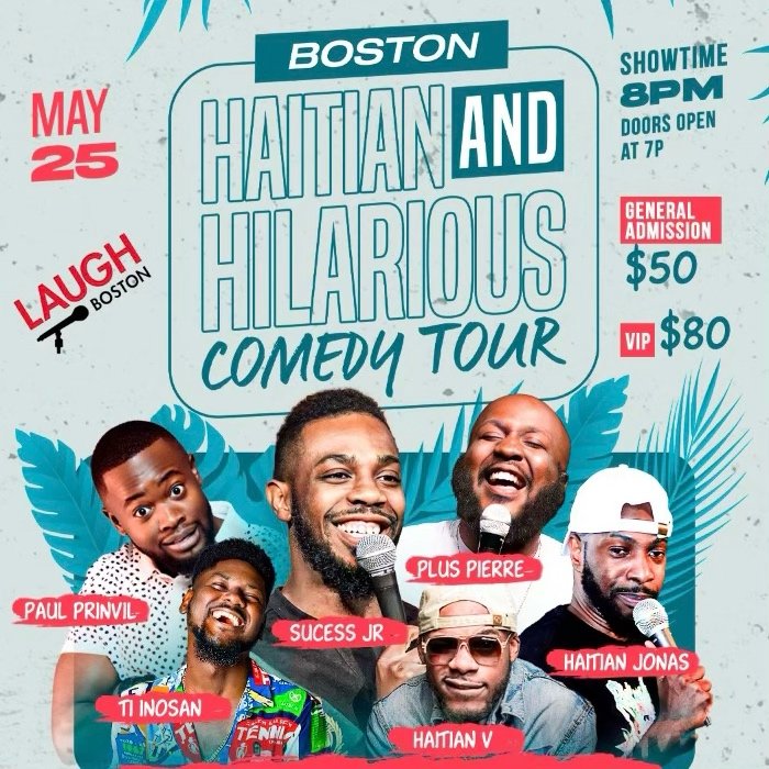 Haitian & Hilarious Comedy Tour (Boston) Wednesday, May 25, 2022 7:00 PM 10:00 PM 19:00 22:00 Laugh Boston 425 Summer Street Boston, MA, 02210 United States (map) Google Calendar ICS HAITIAN & HILARIOUS COMEDY TOURFeaturing:SUCCESS JR.PLUS PIERREPAUL PRINVILHAITIAN JONASTI INOSANHAITIAN VTickets:PURCHASE HERE