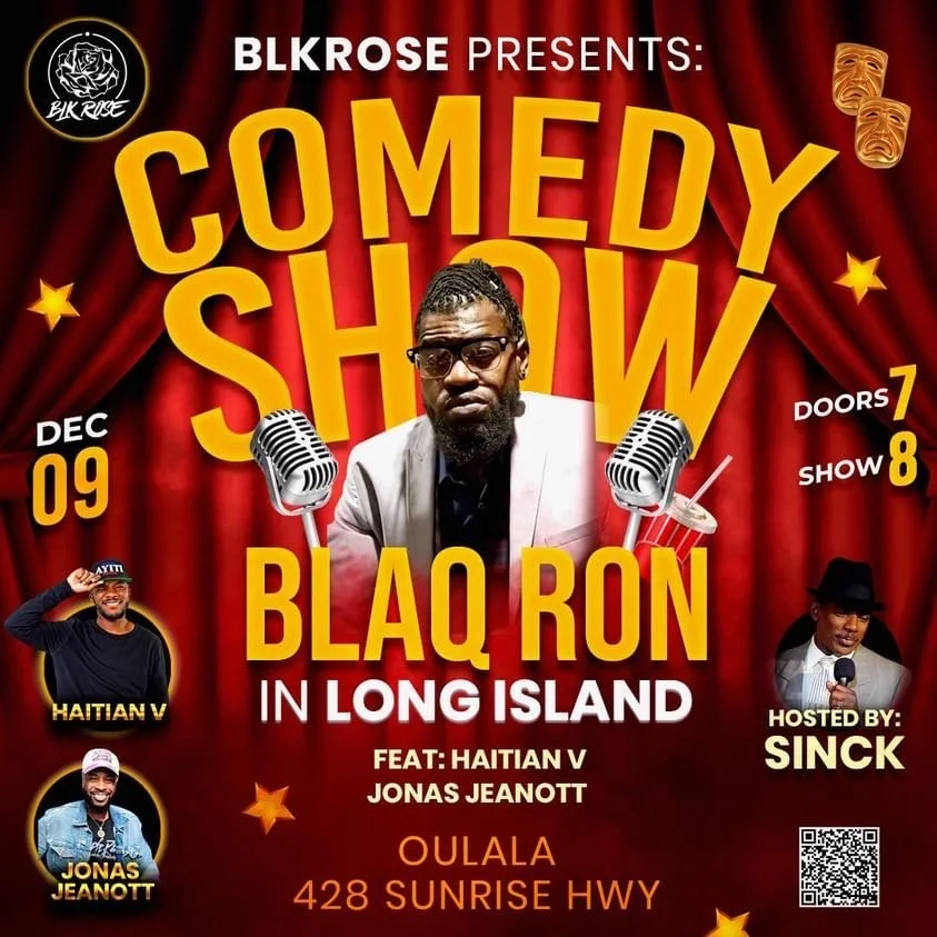 BLAQ RON In Long Island Saturday, December 9, 2023 7:00 PM 10:00 PM 19:00 22:00 Oulala 428 Sunrise Highway Lynbrook, NY, 11563 United States (map) Google Calendar ICS BLK ROSE Presents:COMEDY SHOWBLAQ RON On Long IslandHosted By:SINKFeaturing:HAITIAN VJONAS JEANOTTTickets:PURCHASE HERE
