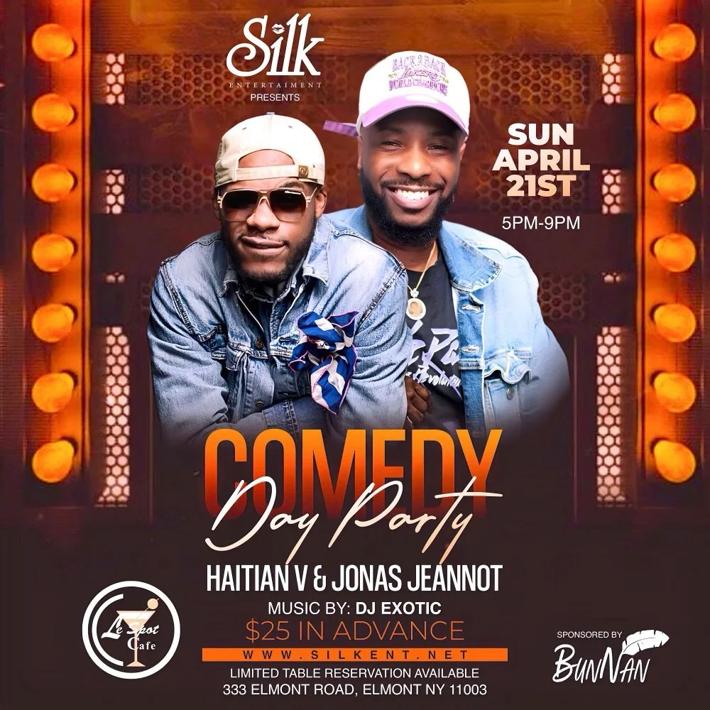 Comedy Day Party Sunday, April 21, 2024 5:00 PM 9:00 PM 17:00 21:00 Le Spot Café 333 Elmont Road New York USA (map) Google Calendar ICS Silk EntertainmentPresentsCOMEDY DAY PARTYFeaturing:HAITIAN VJONAS JEANNOTMusic By:DJ EXOTICTickets:PURCHASE HERE